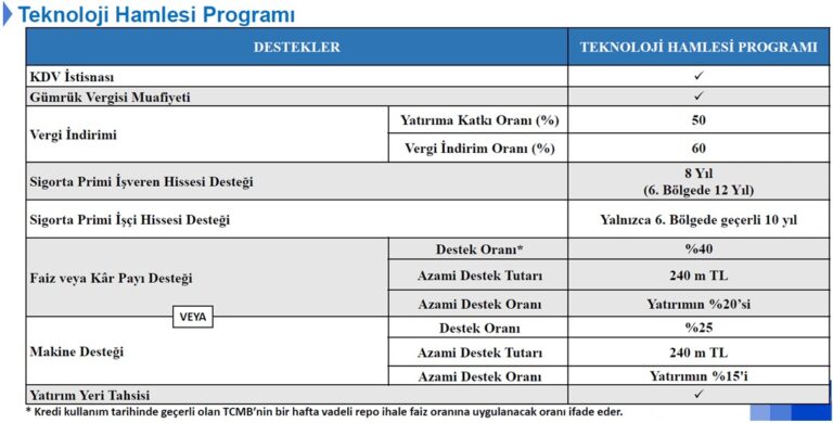 - Teknoloji Hamlesi Programı kapsamında yayımlanan öncelikli ürün listesinde belirtilen yüksek teknolojili ürünlerin üretimine yönelik yatırımlar ile asgari 500 milyon TL tutarındaki yüksek teknolojili ürünlerin üretimine yönelik yatırımlar
